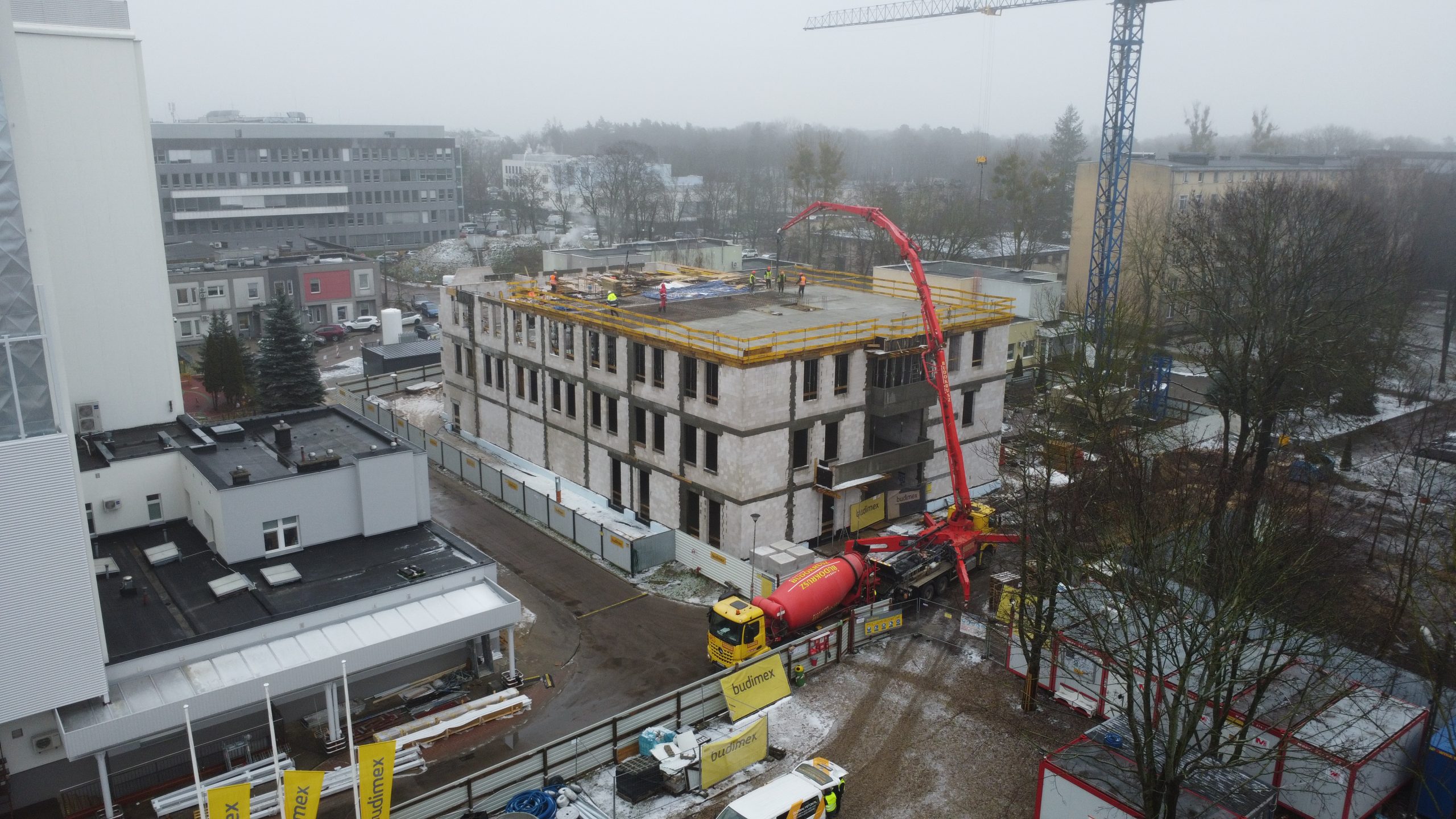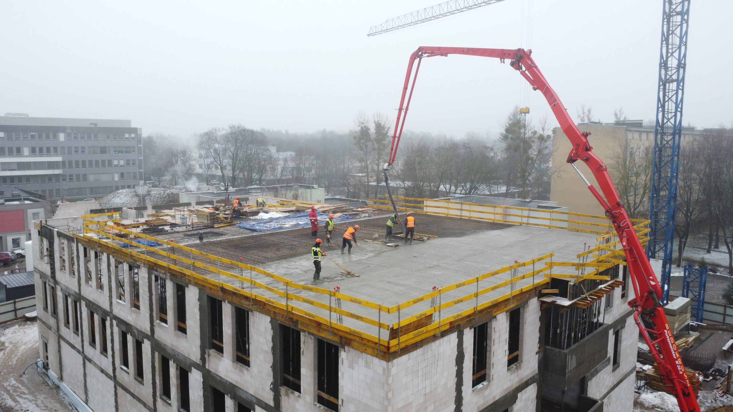 – Budowa CBiBK to nie tylko projekt inżynierski, ale również wyzwanie organizacyjne – mówi. – Lokalizacja w ścisłym centrum Białegostoku, w otoczeniu zabudowy szpitalnej, wymagała precyzyjnego planowania dostaw i harmonogramów robót. Największe trudności to ograniczona przestrzeń składowania – brak dużych placów, który wymusił stosowanie dostaw „just-in-time” i etapowanie prac. Poza tym, znajdujemy się w strefie intensywnego ruchu w rejonie szpitala – od wczesnych godzin porannych przejazd ciężkiego sprzętu i transportu materiałów był utrudniony, co wymagało koordynacji z administracją szpitala. Bezpieczeństwo i dostępność – konieczność utrzymania ciągłości komunikacji dla karetek i personelu medycznego ograniczała czasowe zamknięcia dróg. Precyzyjna logistyka – dostawy betonu, stali odbywały się w oknach czasowych, przed nastaniem wzmożonego ruchu. Aby pokonać te trudności wdrożyliśmy system harmonogramowania dostaw, zsynchronizowany z etapami robót. Wprowadziliśmy ścisłą kontrolę BHP i oznakowanie terenu, wyznaczyliśmy strefy niebezpieczne, aby zapewnić bezpieczeństwo w ruchliwym otoczeniu.
