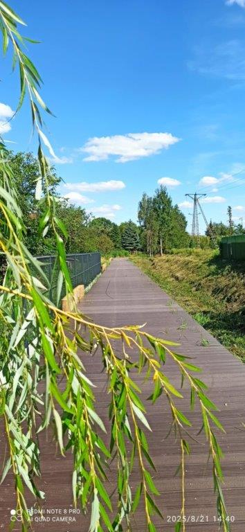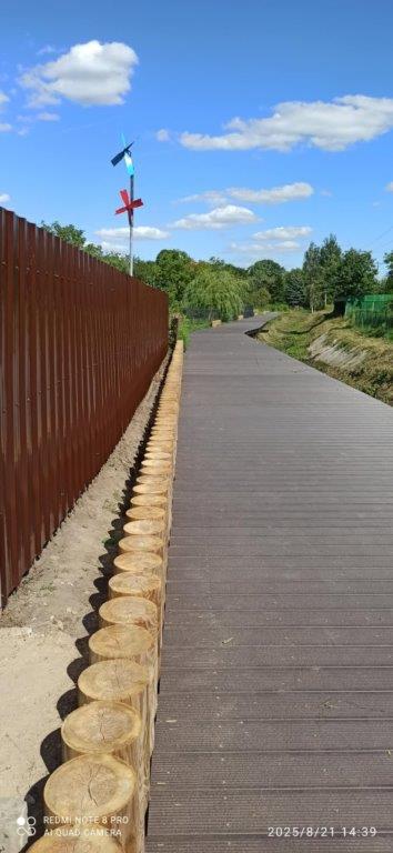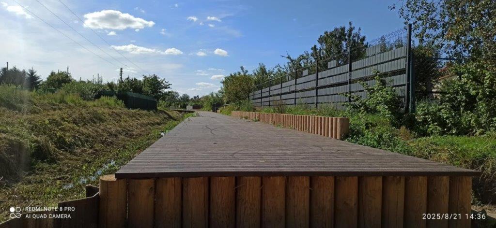– W niektórych miejscach z drugiej strony (od strony brzegu) ze względu na dowiązywanie do istniejącego terenu miejscami musieliśmy zrobić zabezpieczenie skarpy, która była wyżej niż pomost – kontynuuje kierownik. – Ma ono formę drewnianej palisady z grubych (ponad 20 cm średnicy) bali. Projektant w tym miejscu zaplanował takie jakby „ławeczki” – będzie to deska z kompozytu zamontowana na elementach drewnianych. W okolicach istniejącego mostu robimy zejście z kładki bezpośrednio na istniejący chodnik. Teren będzie oświetlony.