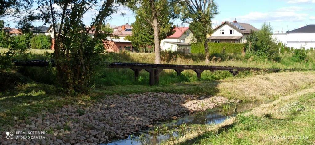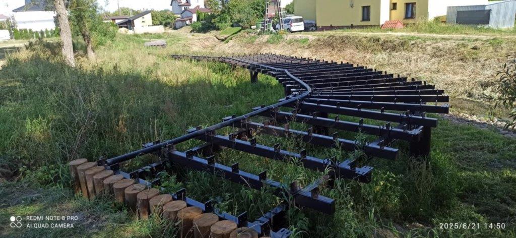 – Rzeczywisty stan terenu oceniliśmy dopiero po wykoszeniu trawy i zarośli oraz uporządkowaniu – zaczyna Oskar Kielczyk, kierownik budowy. – Wtedy też okazało się, że planowana ścieżka będzie „ulokowana” bardzo nisko. Tak nisko, że na pewno cała konstrukcja kładek, chociaż… chodniki w dużej części też, będą zalewane. Sytuacja taka miałaby potrwać kilka lat, aż do zbudowania zbiornika retencyjnego, który obecnie jest projektowany. Będzie on regulował poziom wody w rzece i zapobiegnie podtopieniom. Dlatego wspólnie z projektantami i inwestorem podjęliśmy decyzję, żeby zamienić konstrukcję drewnianą na stalową. Nawet jeśli nie będzie podtopień, to i tak trwałość stali będzie o wiele dłuższa. Pokład miał być z kompozytów i tak zostało.