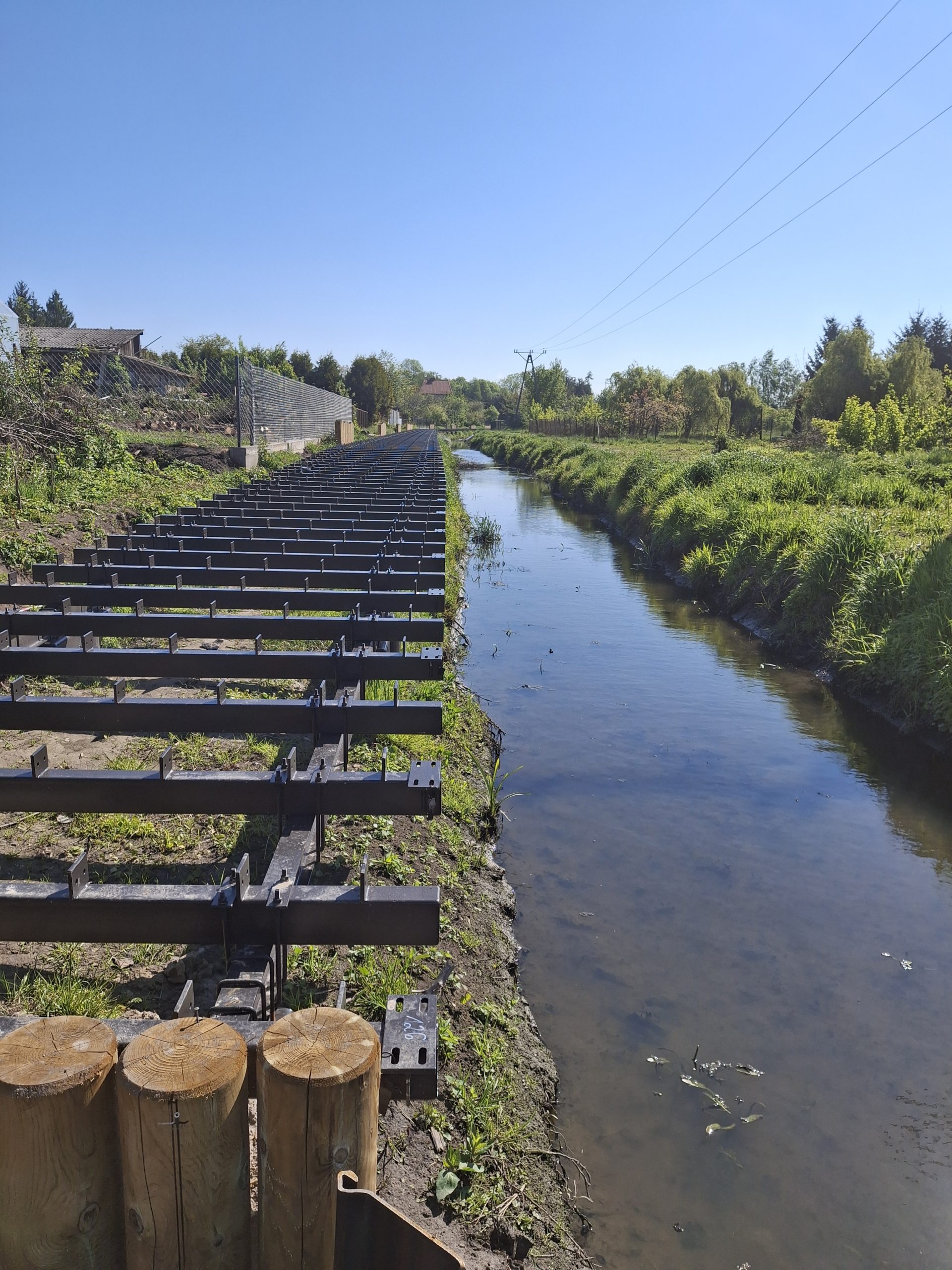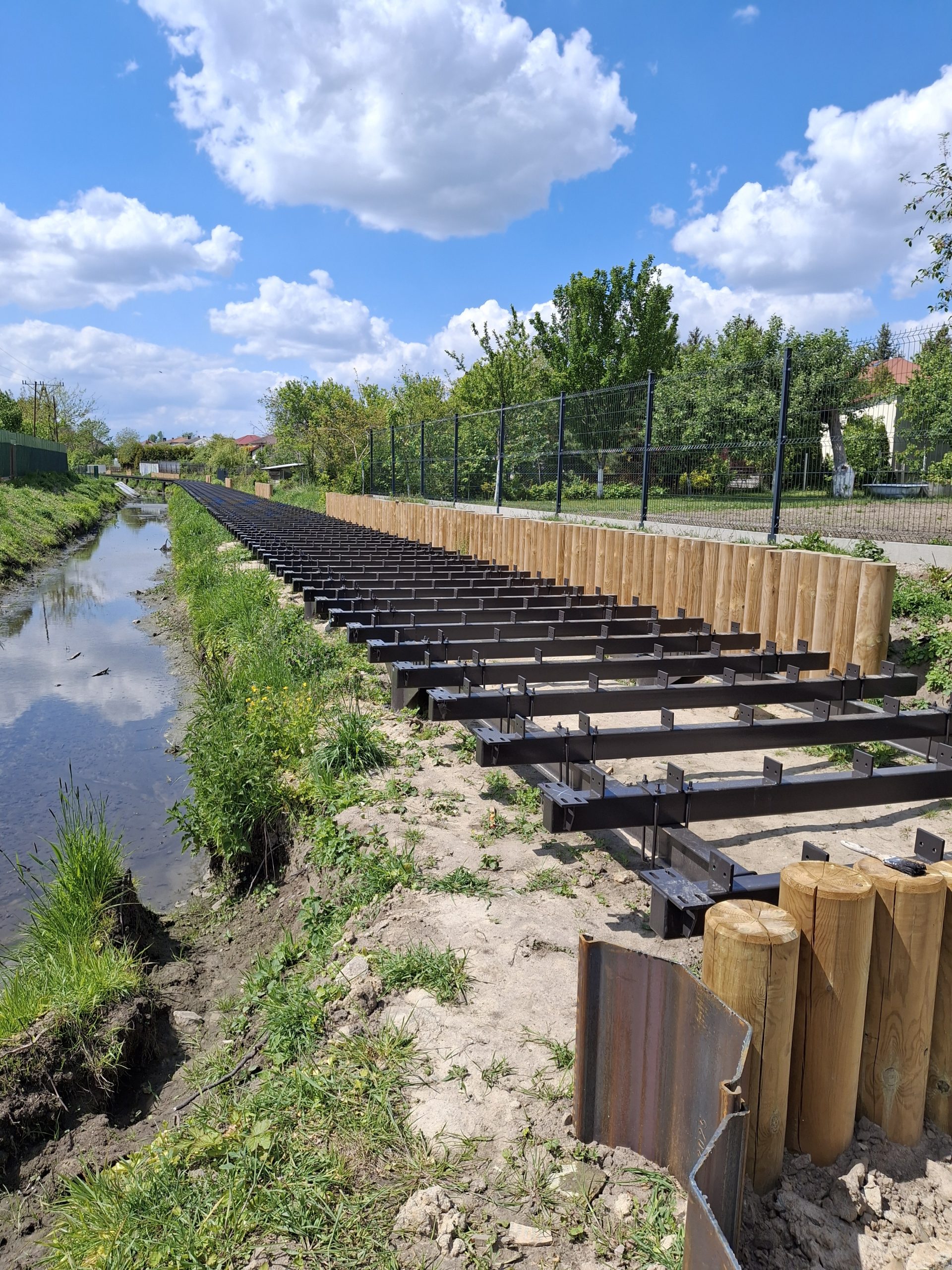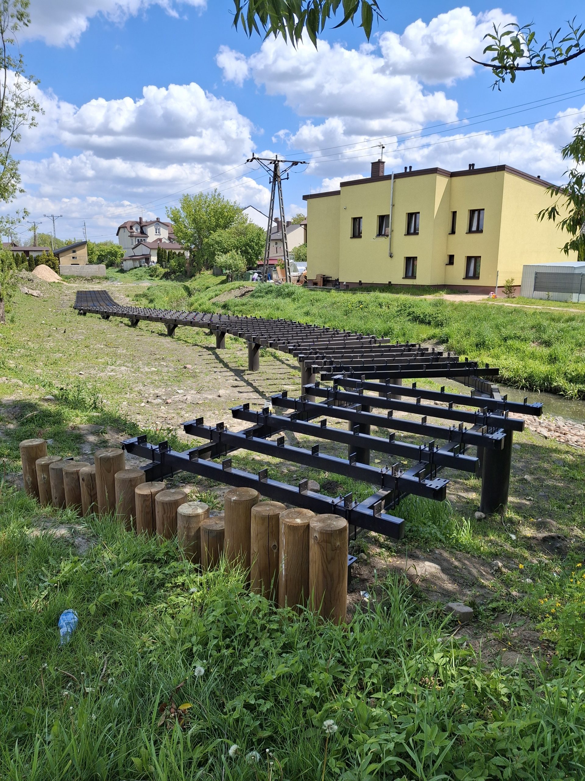 – Rzeczywisty stan terenu oceniliśmy dopiero po wykoszeniu trawy i zarośli oraz uporządkowaniu – zaczyna Oskar Kielczyk, kierownik budowy. – Wtedy też okazało się, że planowana ścieżka będzie „ulokowana” bardzo nisko. Tak nisko, że na pewno cała konstrukcja kładek, chociaż… chodniki w dużej części też, będą zalewane. Sytuacja taka miałaby potrwać kilka lat, aż do zbudowania zbiornika retencyjnego, który obecnie jest projektowany. Będzie on regulował poziom wody w rzece i zapobiegnie podtopieniom. Dlatego wspólnie z projektantami i inwestorem podjęliśmy decyzję, żeby zamienić konstrukcję drewnianą na stalową. Nawet jeśli nie będzie podtopień, to i tak trwałość stali będzie o wiele dłuższa. Pokład miał być z kompozytów i tak zostało.