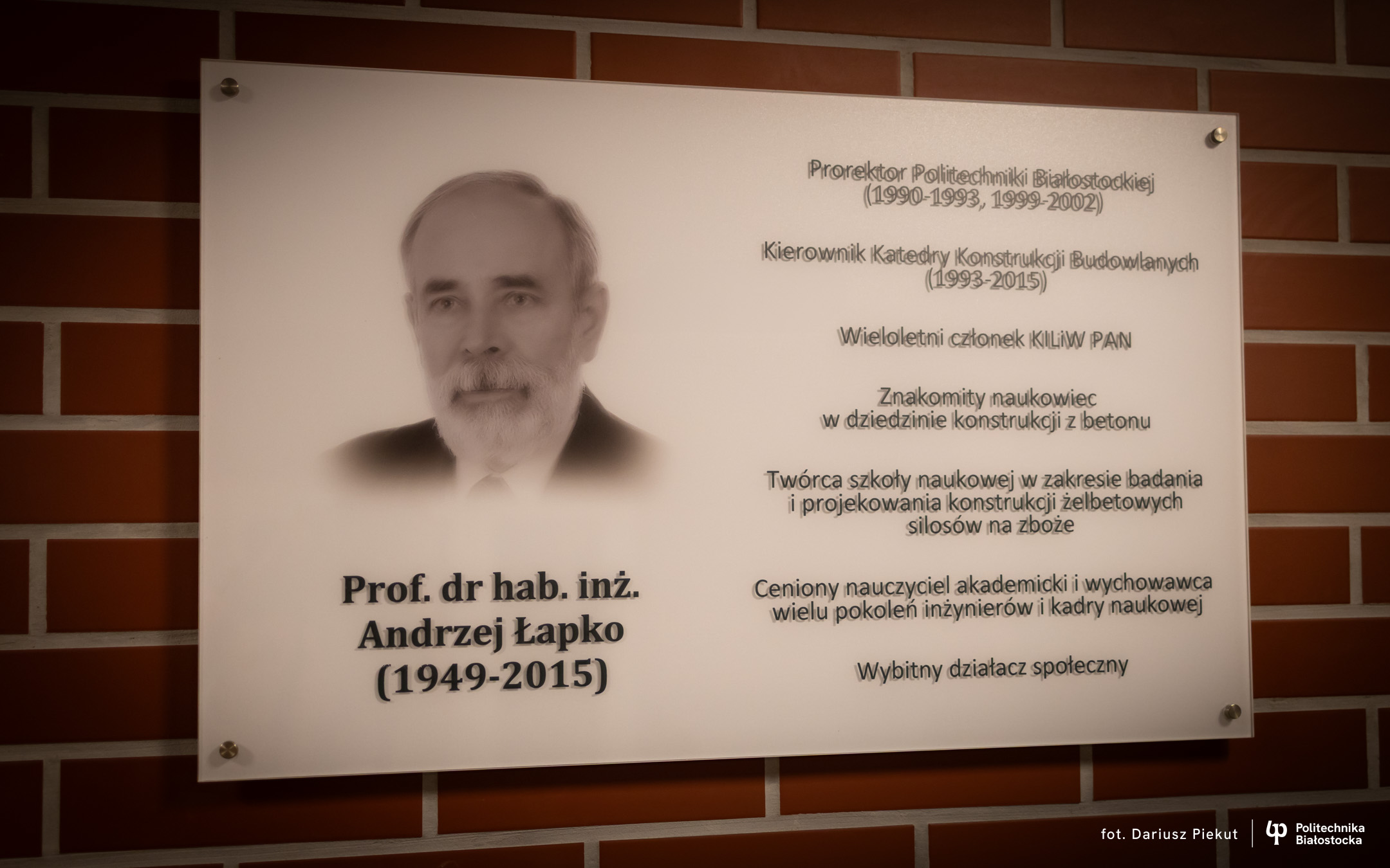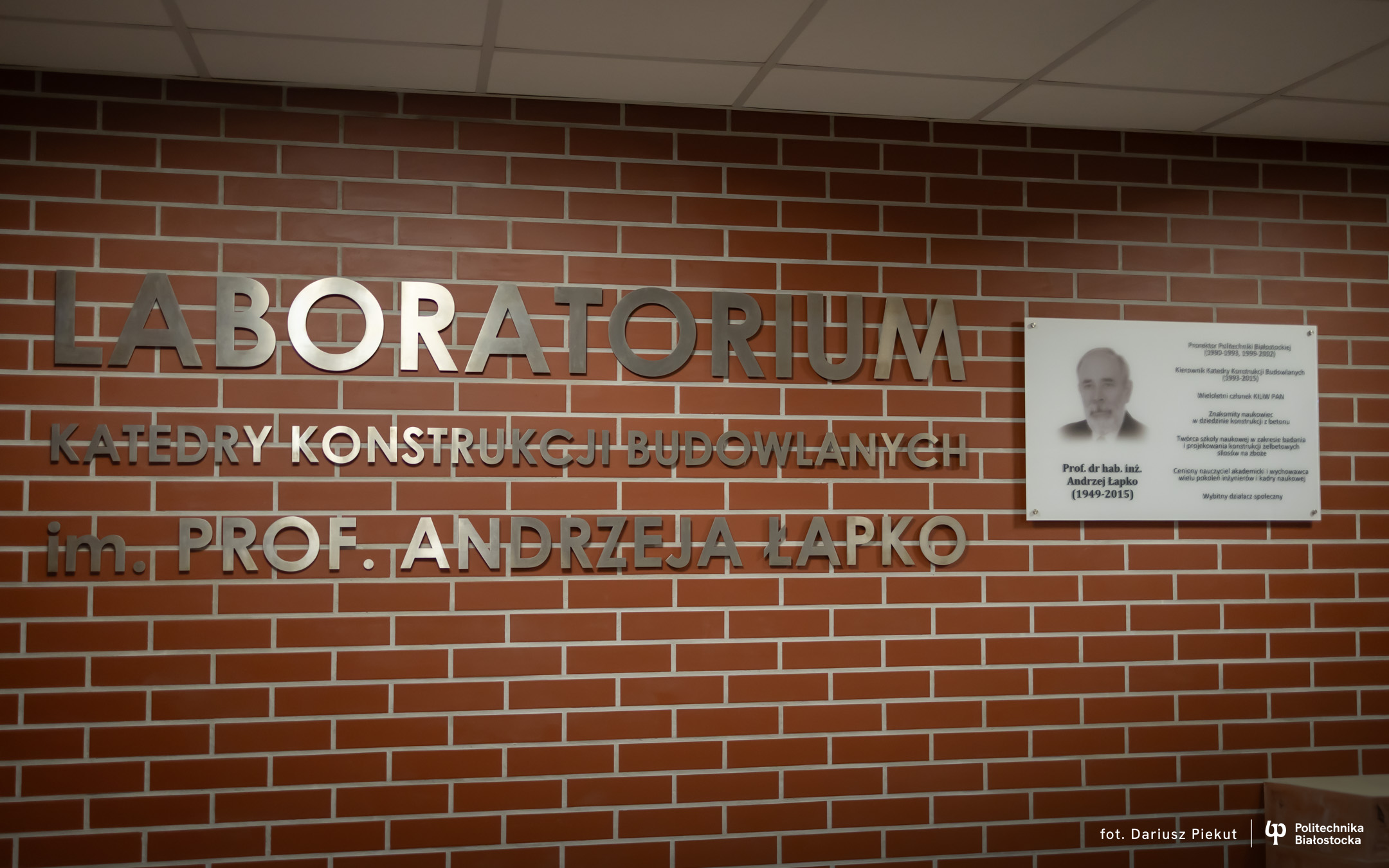 W ostatnich latach swojej działalności prof. Andrzej Łapko stworzył na uczelni Laboratorium Katedry Konstrukcji Budowlanych do prowadzenia badań materiałów i konstrukcji na europejskim poziomie. Dzisiaj jego działalność naukową kontynuują wychowankowie, a Laboratorium nosi jego imię. W ten sposób upamiętniliśmy go w dowód wdzięczności za wieloletnią nieustanną inspirację do twórczej pracy i motywację do poszukiwania własnych dróg naukowych, które pozwoliły nam rozwinąć się zawodowo. Jego rozumna i pełna dobroci twarz i uśmiech jego oczu spoglądających na nas z tablicy pamiątkowej towarzyszą nam codziennie