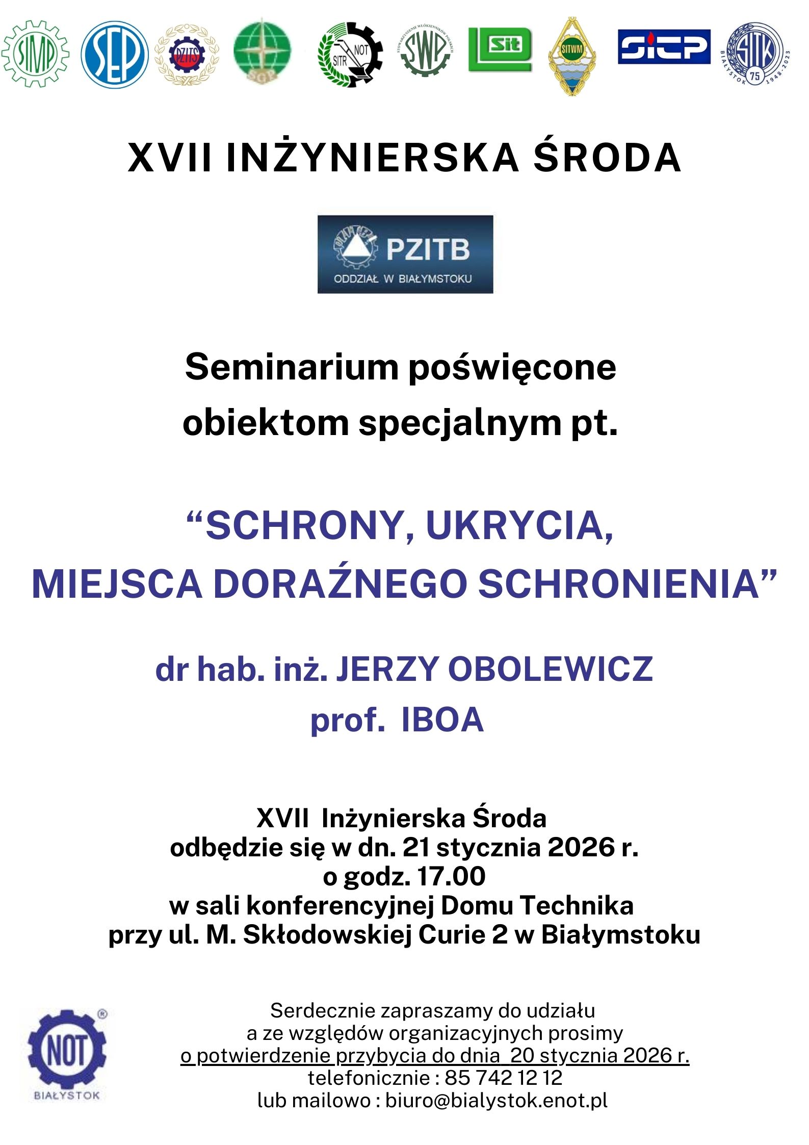 „Schrony, ukrycia, miejsca doraźnego schronienia” to temat pierwszej w tym roku, styczniowej, XV edycji Inżynierskiej środy. Zapraszamy serdecznie 21. stycznia 2026 r.