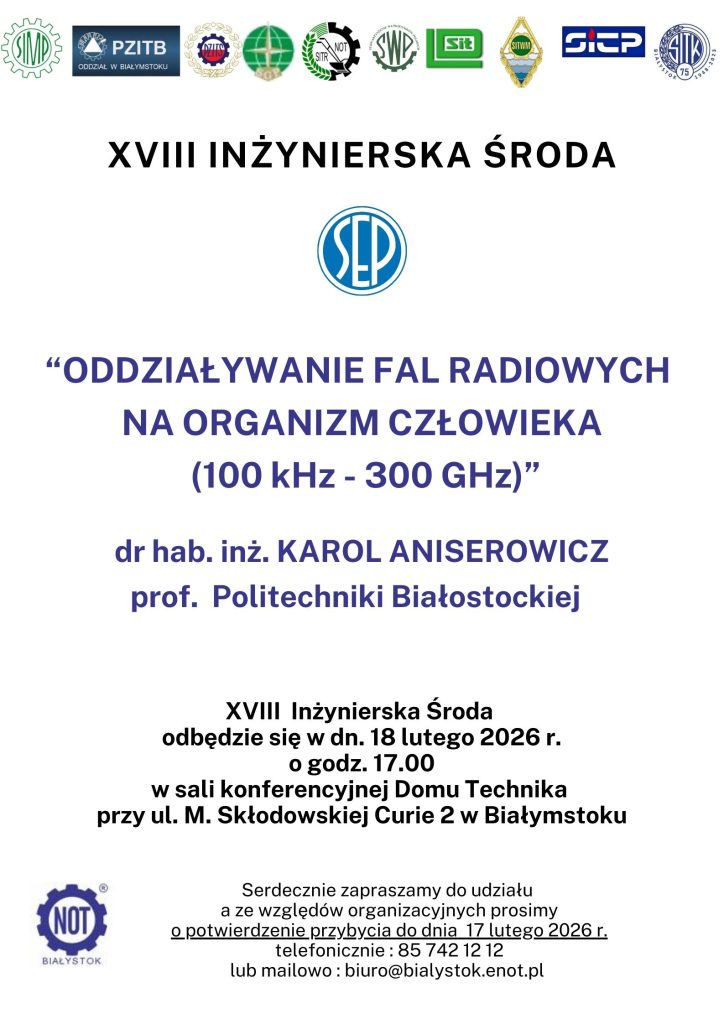 „Oddziaływanie fal radiowych na organizm człowieka (100 kHz-300 GHz)” to temat lutowej, XVIII edycji Inżynierskiej środy. Zapraszamy serdecznie 18. lutego 2026 r.